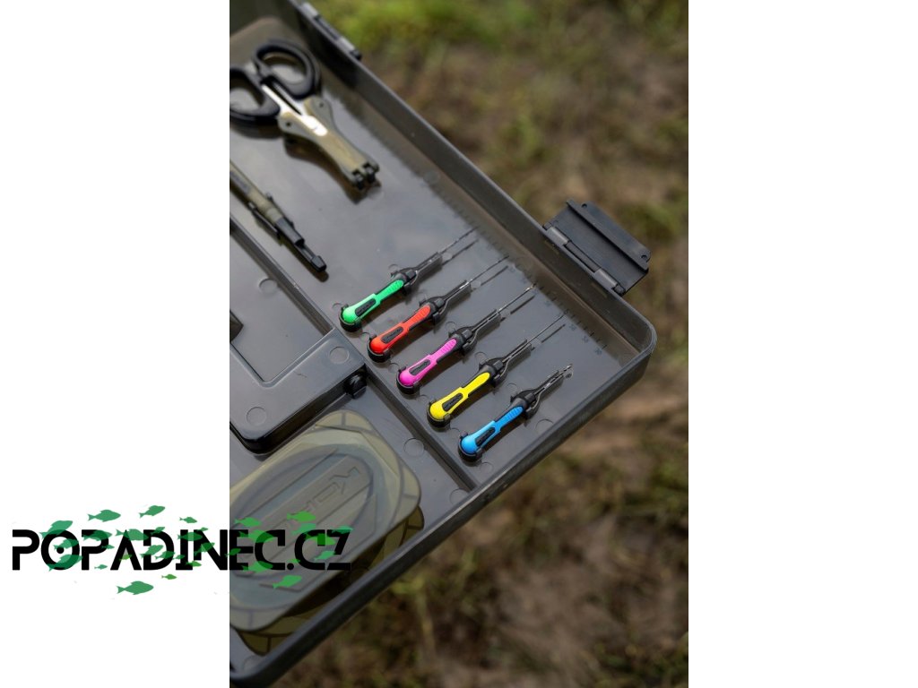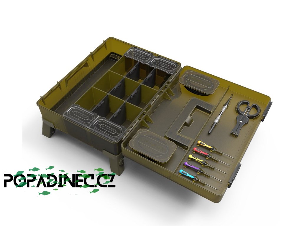Vaše nástroje na krmení, odháčkovávač a nůžky se pohodlně zakliknou na své místo, zatímco hlavní část boxu lze upravit pomocí přepážek podle vašich potřeb. Víko obsahuje dva mělké RIG BLOX, které uchovají všechny vaše předvázané návazce v bezpečí před vlivy počasí.
