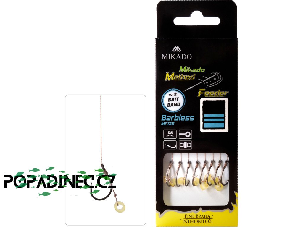 Háčky MF13 bez protihrotu začleněné do Method Feeder návazců. Zakončené prvotřídním opletem, gumičkou pro upevnění nástrahy a ďábelsky ostrým háčkem bez protihrotu MF13.