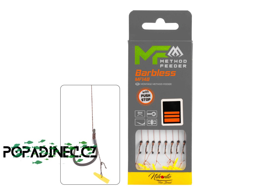 Hotové method návazce na háčcích MF14 bez protihrotu. Extrémně ostré, pevné, s koncem Push Stop, gumička nebo trn. Na pletené šňůře i monofil.