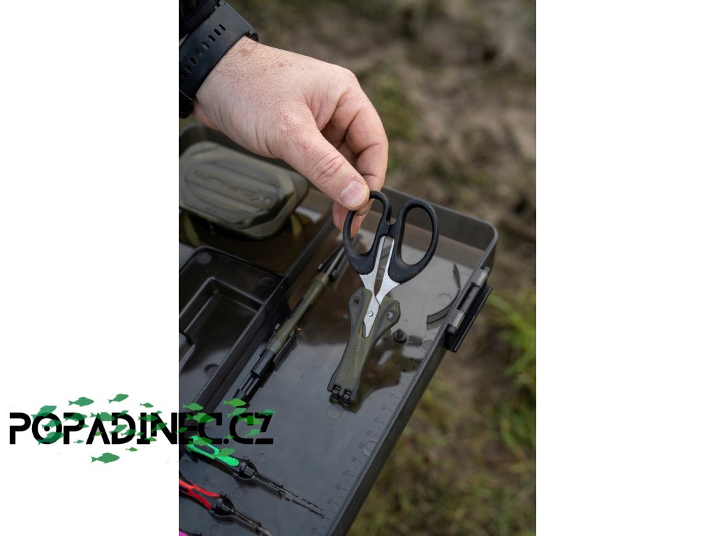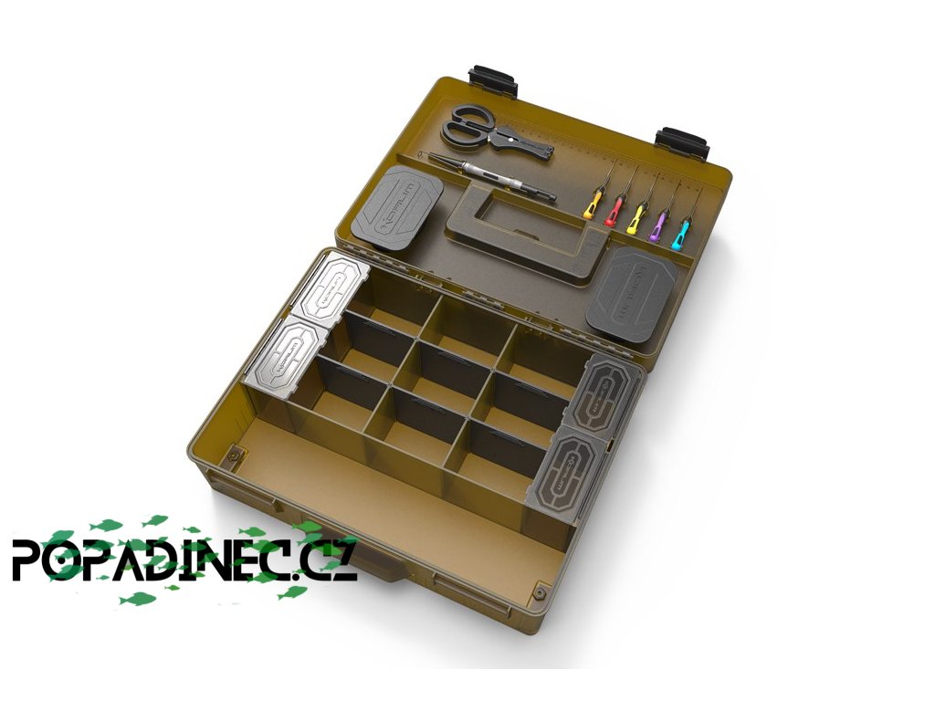 Vaše nástroje na krmení, odháčkovávač a nůžky se pohodlně zakliknou na své místo, zatímco hlavní část boxu lze upravit pomocí přepážek podle vašich potřeb. Víko obsahuje dva mělké RIG BLOX, které udrží všechny vaše předvázané návazce v bezpečí před vlivy počasí.