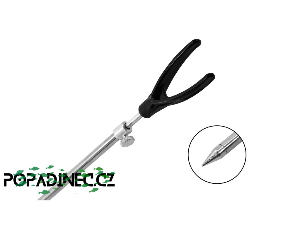 Velmi pevná, teleskopická, zadní vidlička s držákem na prut. Vyrobena je z oceli, díky čemuž je výjimečně pevná. Vrchní část vidličky je pevně osazena držákem prutu. Požadovanou výšku nastavíte jednoduše pomocí závitu s maticí, která slouží k zafixování výšky rybářské vidličky.