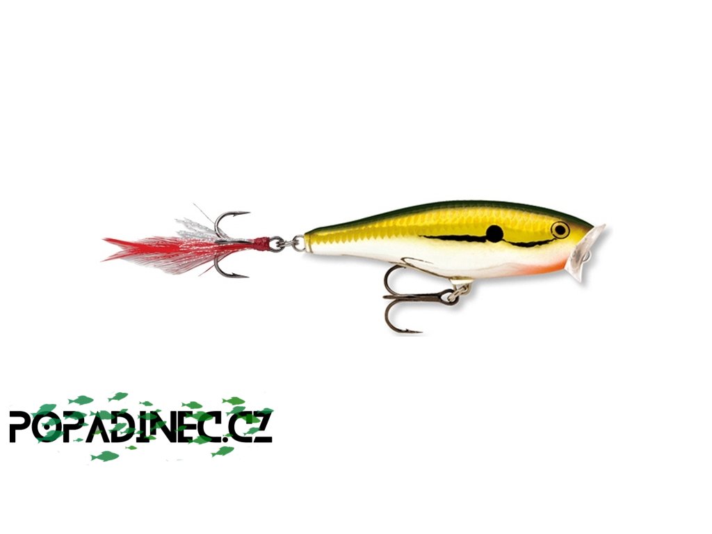 Wobler Rapala Skitter Pop. Jedná se o balzový wobler určený pro lov na hladině. Nástraha díky tvaru hlavy vytváří ve vodě shluk bublin provázený specifickým zvukem. Velmi účinné v místech nad vodním porostem, či v případě, že ryby loví u hladiny.