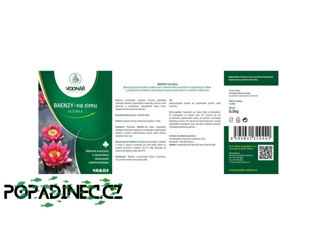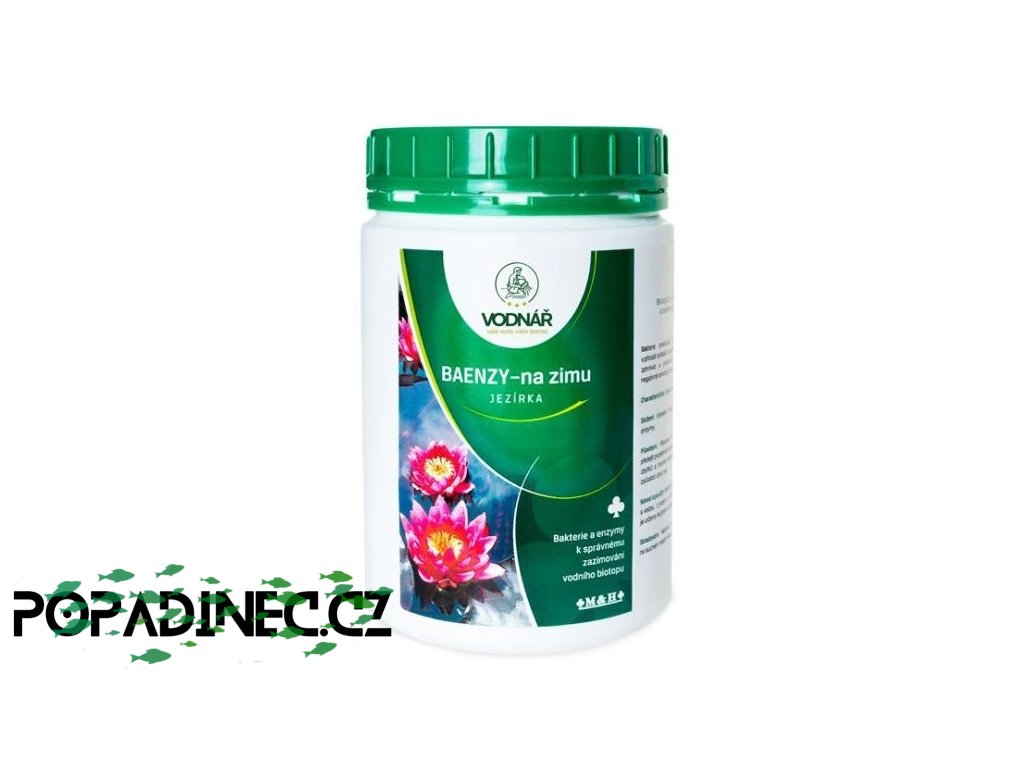 Vodnář Baenzy na zimu je biologický přípravek pro odbourání nadměrného množství organických látek a zamezení produkce jedovatých plynů pod ledem v zimních měsících.